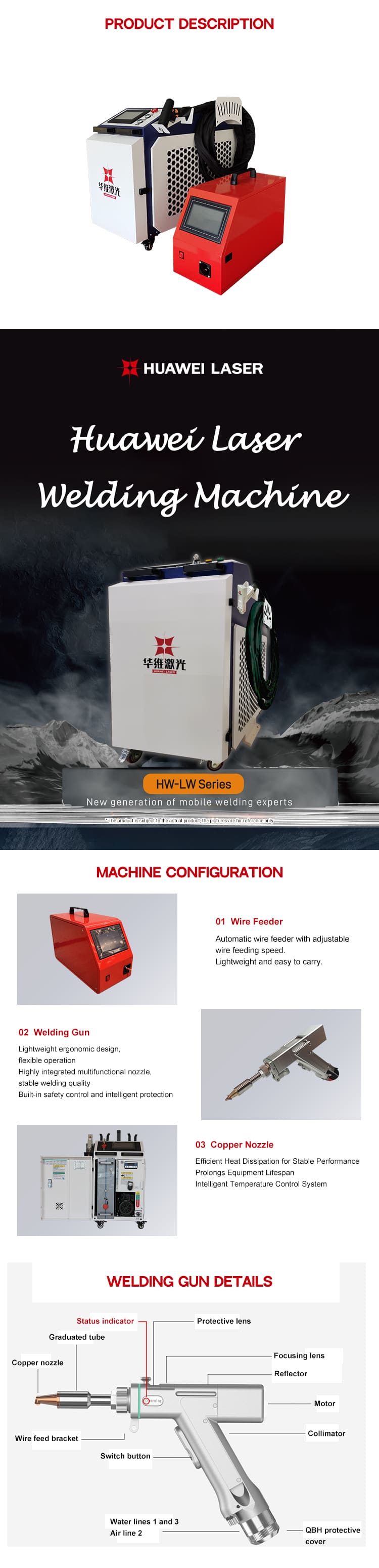 دستگاه جوش لیزری HUAWEI LASER 1200W 1500W 2000W 3000W برای فلز 3 در 1 جوشکار لیزری قابل حمل که عملکردهای جوش، برش و تمیز کردن را یکپارچه می کند. طراحی شده برای راندمان و دقت بالا، عملکرد پایداری را در طیف گسترده ای از مواد فلزی مانند فولاد ضد زنگ، فولاد کربن و آلومینیوم ارائه می دهد. جمع و جور و کارکرد آسان، هم برای تولید صنعتی و هم برای کارهای تعمیر در محل مناسب است. این راه حل جوش لیزری با پشتیبانی از تحقیق و توسعه قوی HUAWEI LASER، قابلیت ساخت پیشرفته و موجودی کافی، کیفیت قابل اعتماد، تحویل سریع و نتایج عالی را برای کاربران جهانی ارائه می دهد.