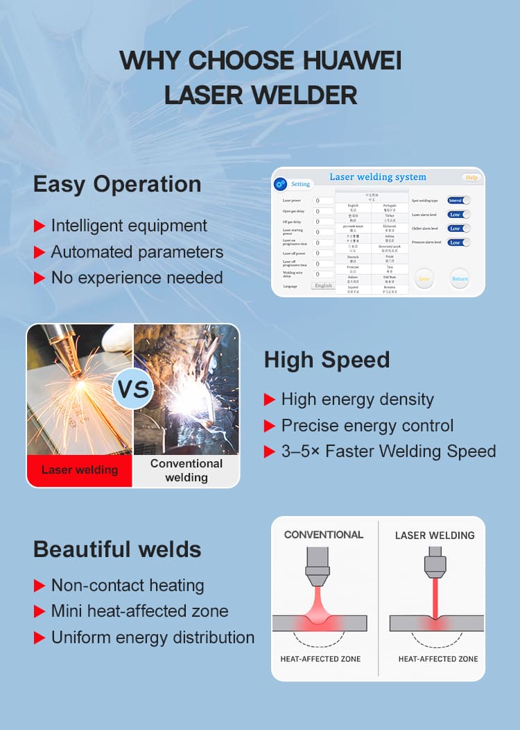 4. آسان برای کار و یادگیری: عملیات جوش لیزری دستی ساده و آسان برای یادگیری است، صرفه جویی در هزینه های نیروی کار و مناسب برای آموزش سریع و القاء.